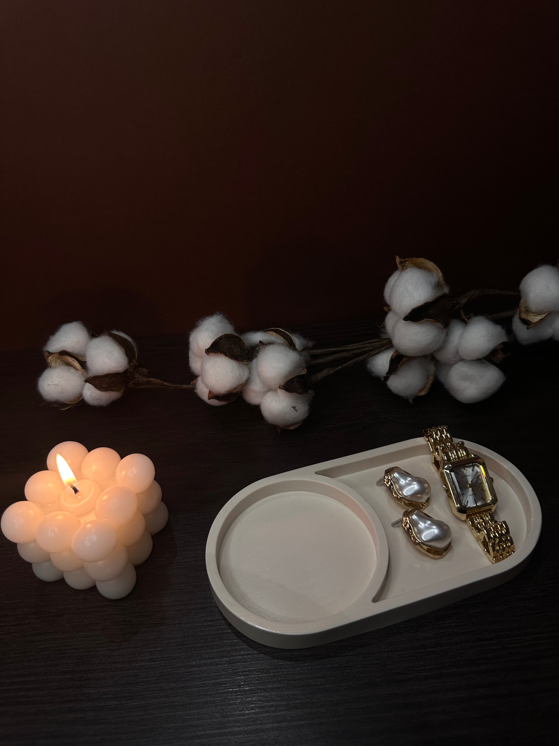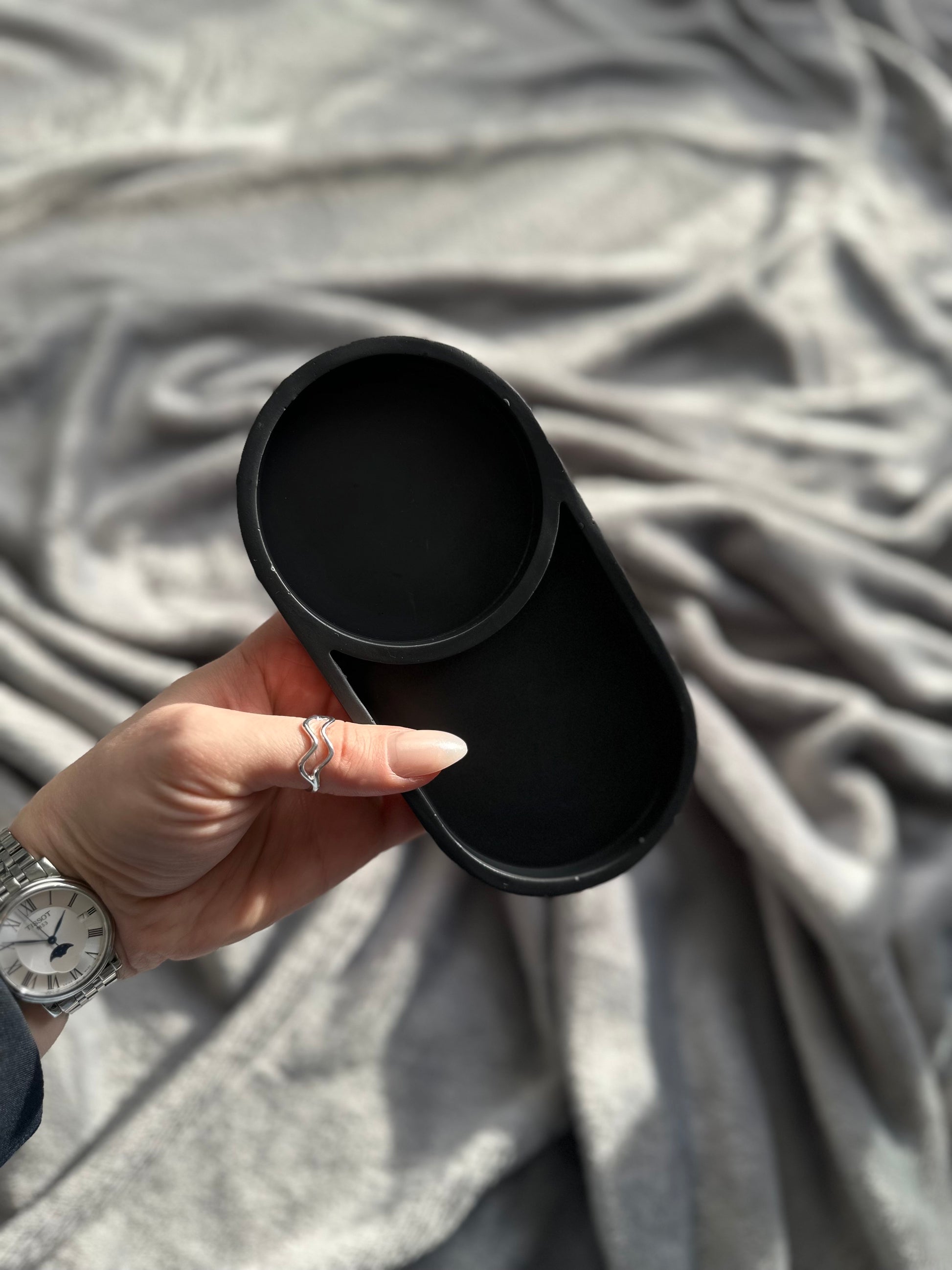 Ses lignes lisses et son rebord délicatement relevé apportent une sensation de fluidité, tout en assurant une parfaite stabilité. Minimaliste et épuré, il devient une pièce fonctionnelle et esthétique, idéale pour accueillir bijoux, accessoires, bougies ou créations parfumées.