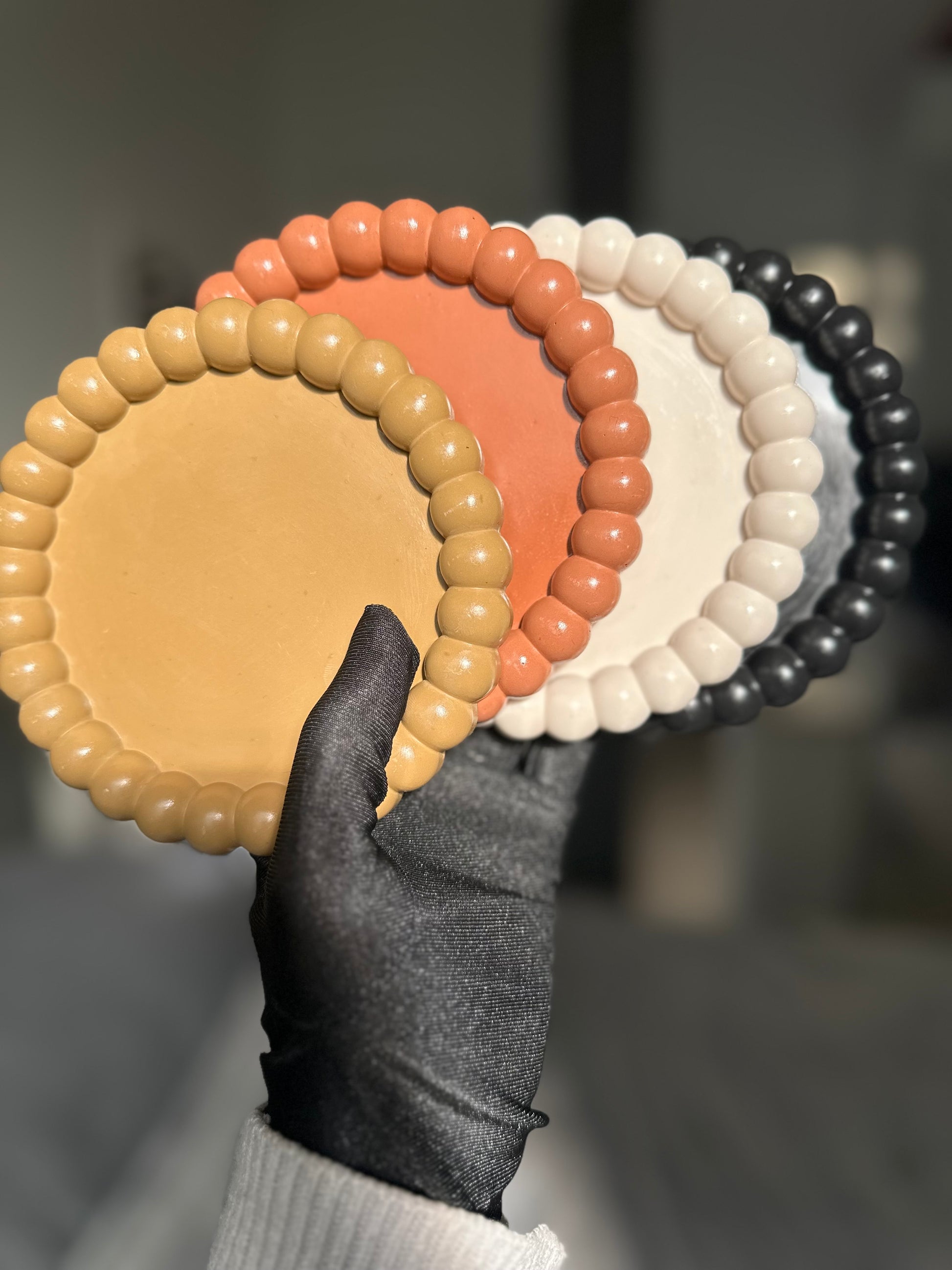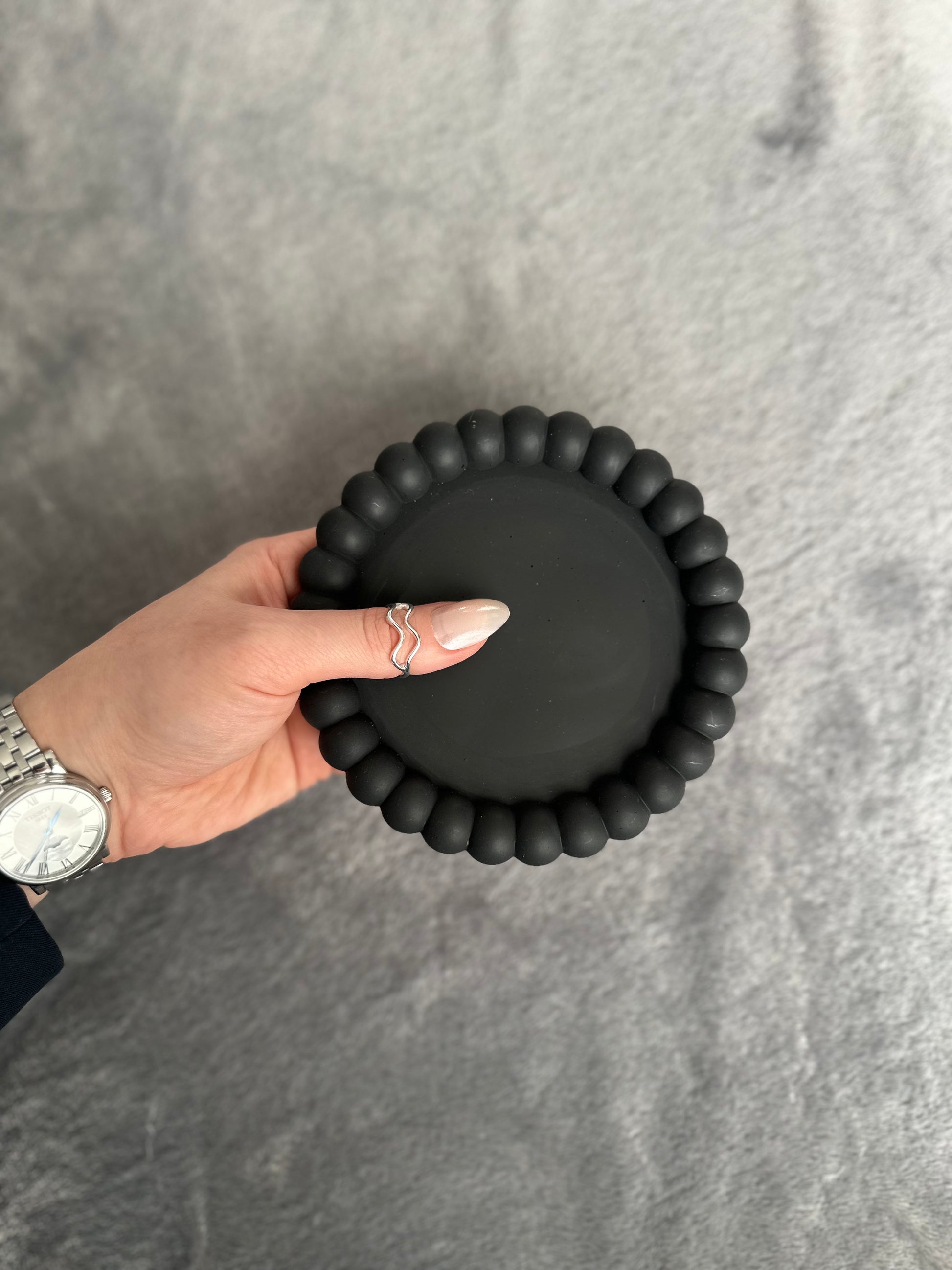 BULMA se distingue par sa silhouette circulaire, entourée d’un contour sculpté en une succession de formes arrondies rappelant de petites perles juxtaposées. Cette bordure régulière crée un jeu de relief dynamique qui contraste délicatement avec la surface intérieure parfaitement lisse et plane.
