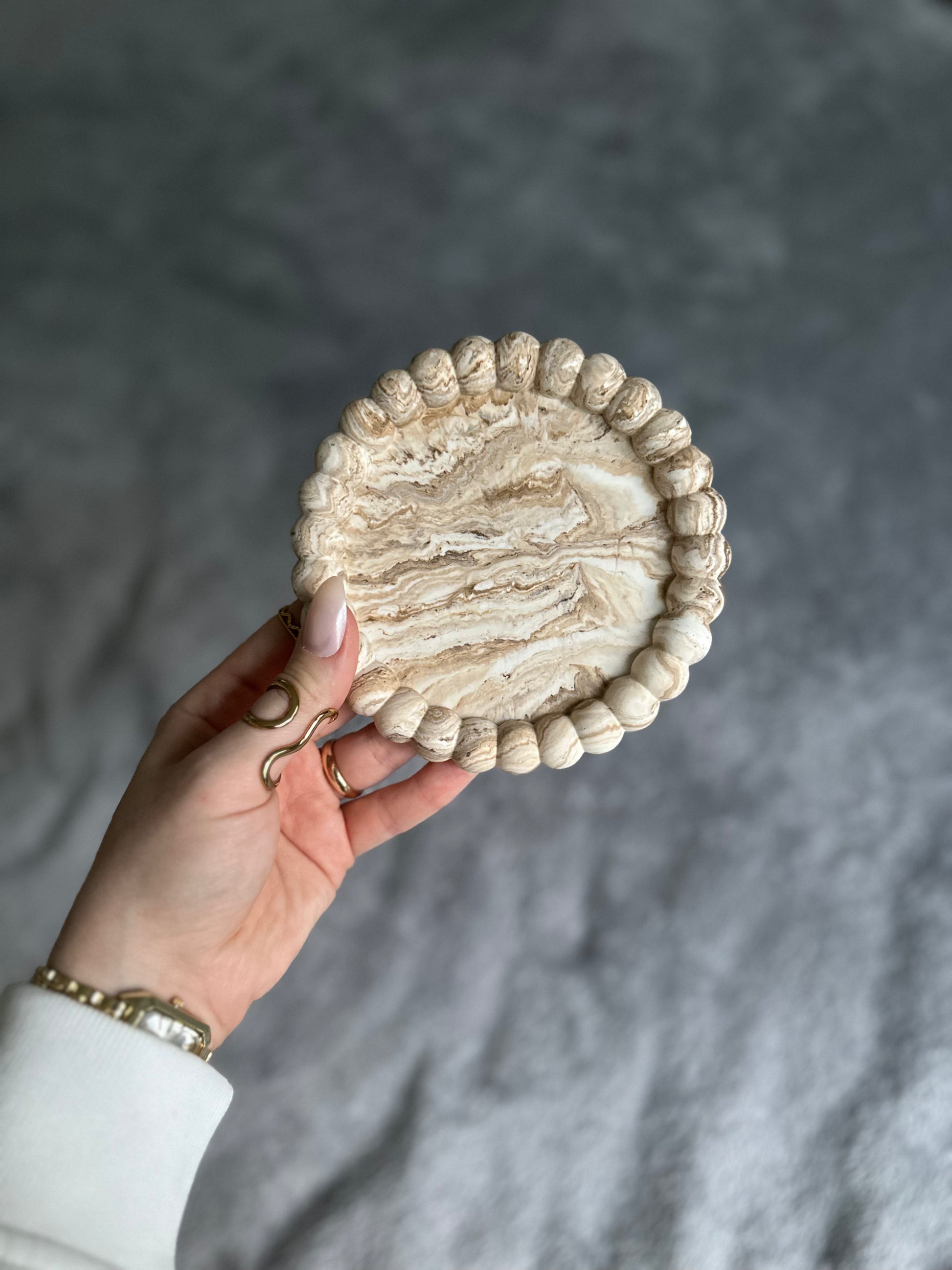 Idéal pour accueillir vos bijoux du quotidien, poser une bougie ou sublimer un petit coin de décoration grâce à son contour perlé qui attire naturellement le regard.